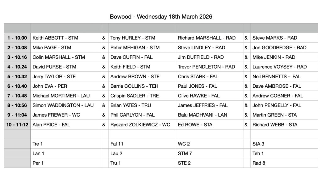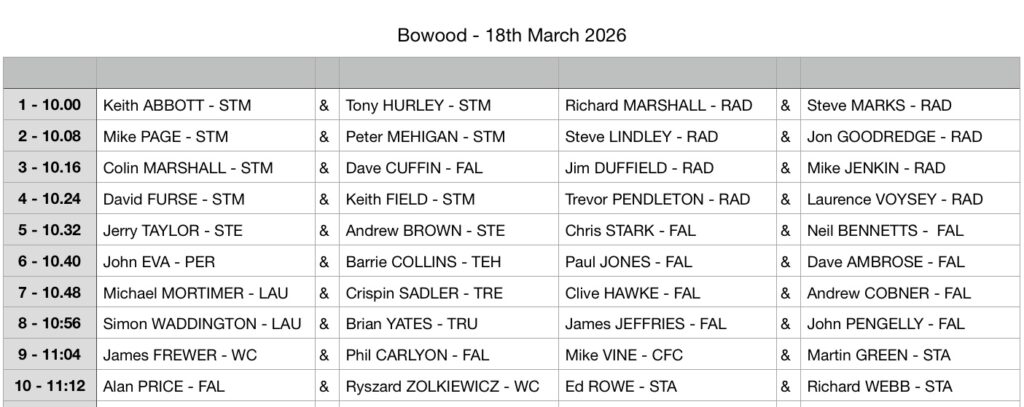 Pairings / groups and start times below for Bowood:
